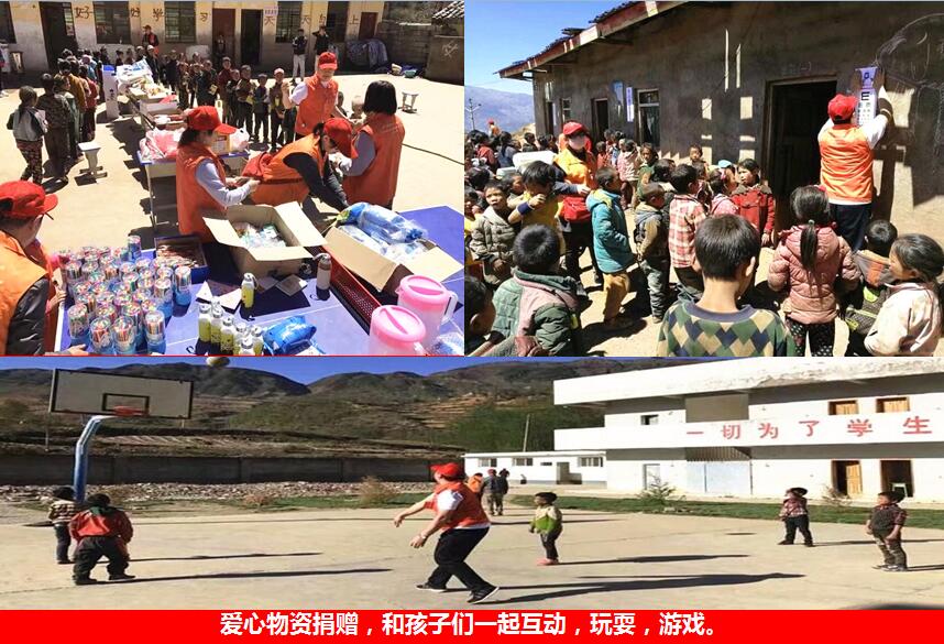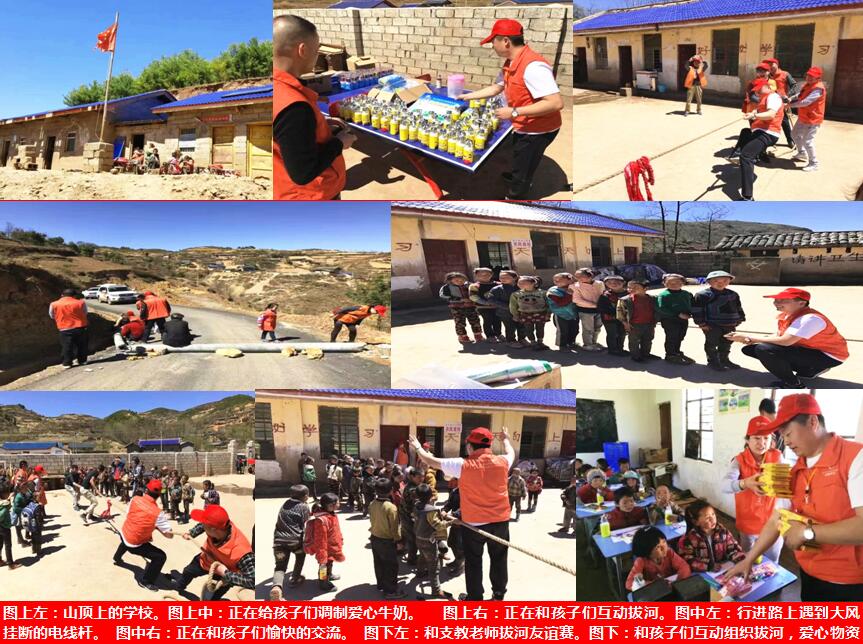 2017年4月7日,在烈日高温中、在支教老师的积极配合下、在蓝天白云美景里,大家克服崎岖泥泞的山路,自己动手搬运大风刮倒的电线杆,冒着滚落的山石,志愿者们按计划开展了累计24个小时的公益慈善活动,志愿者们和支教老师们快乐拔河、与孩子们打球互动、与校方商议后续关爱计划、教授护眼方法和卫生知识、亲手调制美味的爱心牛奶、赠与文体用品、开展精神关爱等活动,志愿者们前 往了三个山区村小,看望了二十多位老师、四百多位同学,转运传递近千斤爱心物资,大汗淋漓中感悟到了:大爱有你 益路同行…