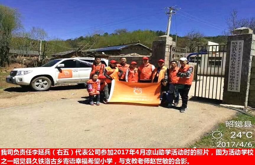 2017年 4月6日,凉山昭觉,迎着朝阳,四川益路同行志愿者:成都瑞诚航空货运李延兵、赵伟、曾斌、赵锞、赵紫瀚、等等”11位志愿者,分乘二辆车,驱车前往海拔三千左右的昭觉县久特洛古乡“寄语幸福希望小学”、阿莫村“瓦吾社小”、谷曲乡“瓦洛基点校”。开展凉山助学活动。